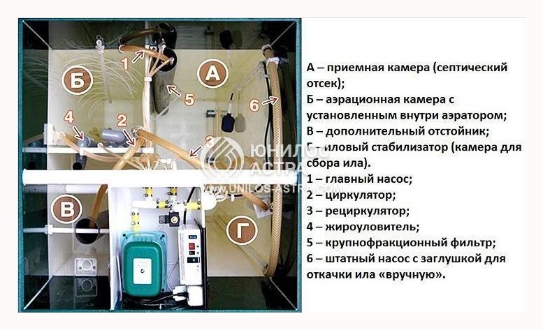 Функционирование станции основано на природных свойствах живых бактерий использовать в своей жизнедеятельности вредные для человека и экологии органические соединения, составляющие смеси из бытовых стоков. Нейтрализация нитритов происходит под влиянием кислорода, ускоряющего процесс их поглощения микроорганизмами. Механика обеспечивает эффективное отделение крупных фракций, формируя однородность состава, которую септик Астра 8 Long, благодаря многоступенчатой обработке «превращает» в эффективное удобрение и техническую воду. Протекающие процессы строго распределены по имеющимся камерам станции: